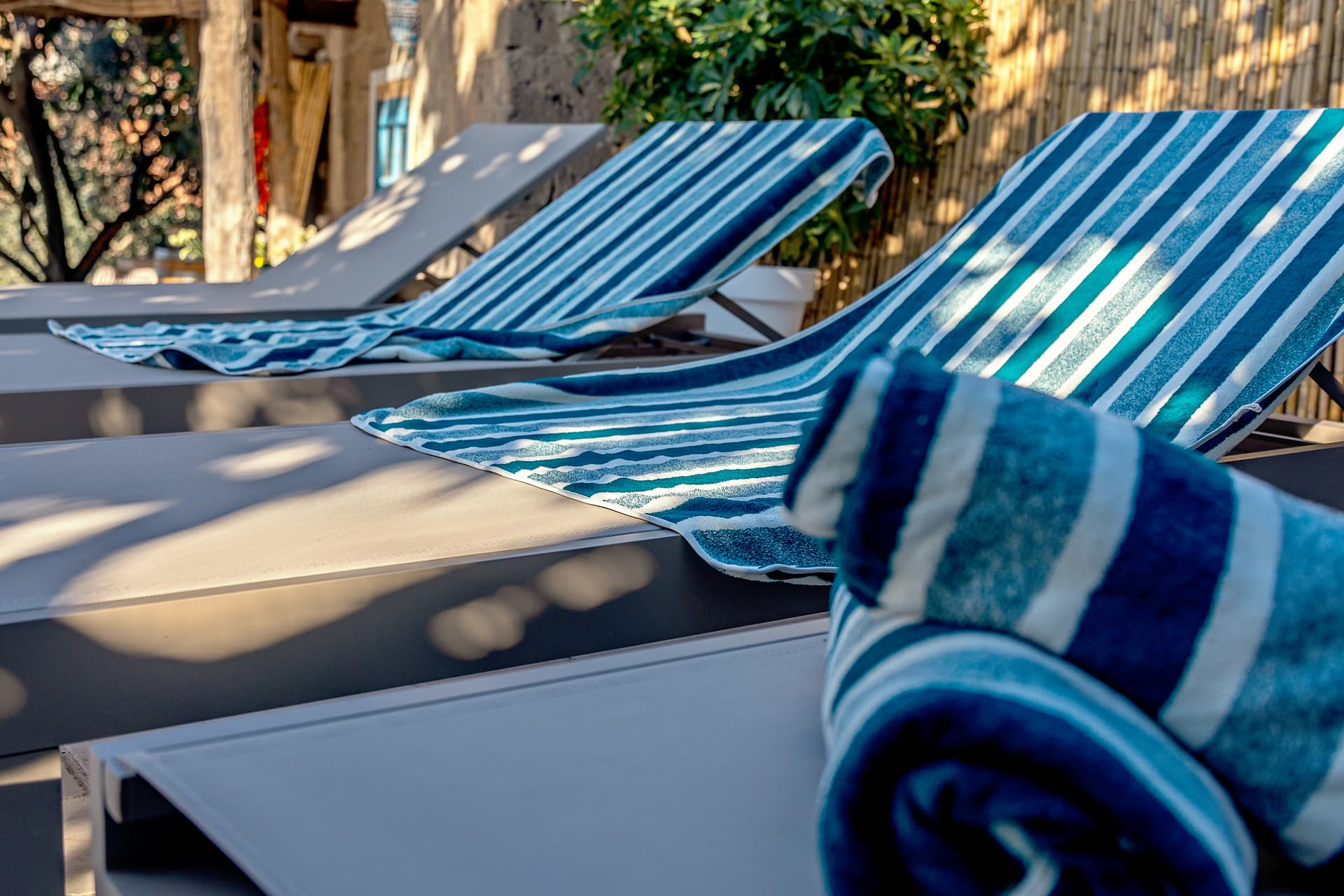 Relax in our lush Mediterranean courtyard with sun loungers and shaded seating areas.