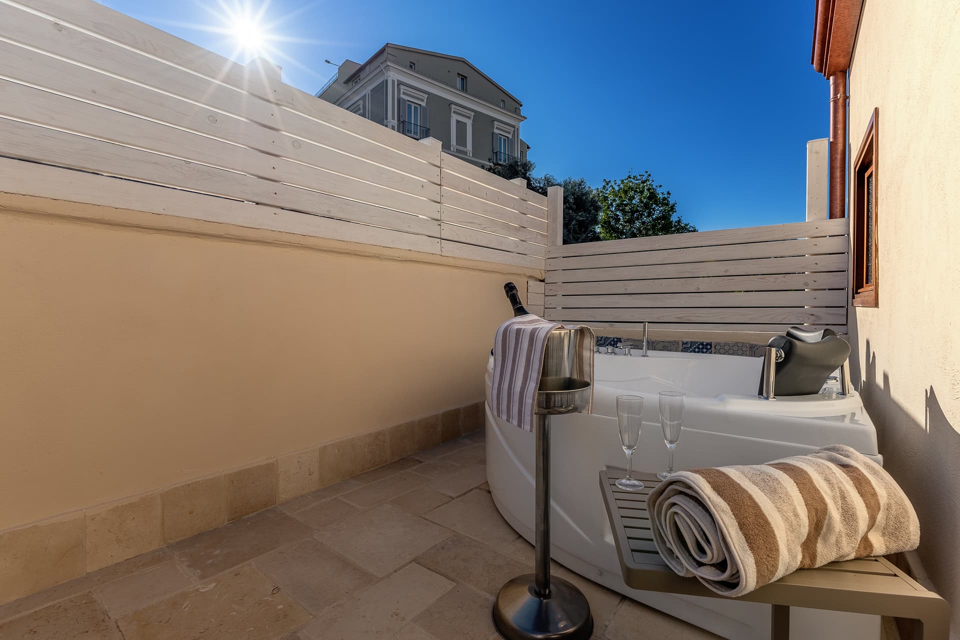 Relax in our lush Mediterranean courtyard with sun loungers and shaded seating areas.